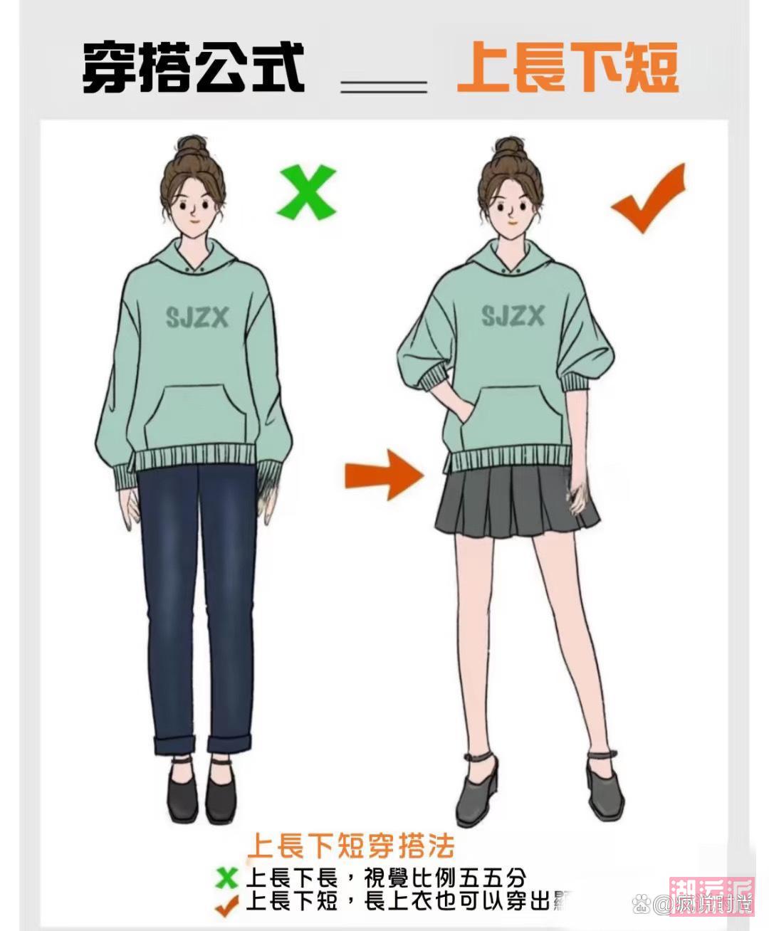 如果选择了款式稍微长一点的上衣,下身就不要太长,尽量选择短款的对比。下衣失踪也是很适合小个子的穿法,长卫衣配短裙远比长卫衣配牛仔裤更时髦。