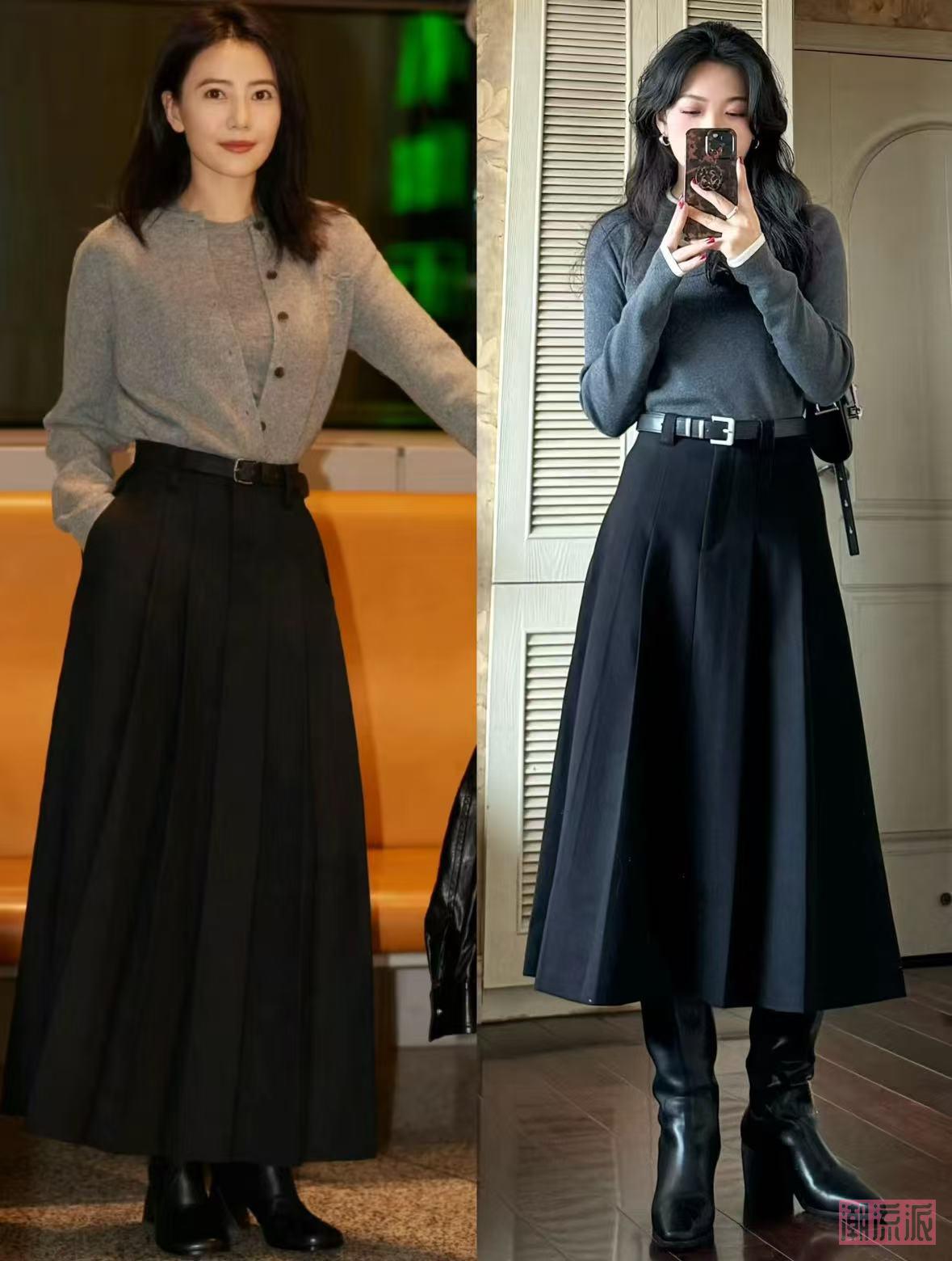 高腰半身裙:长度到膝盖上方10cm最佳,A字版型遮胯,搭配短款毛衣,比如“黑色高腰百褶裙+灰色短款针织衫”,小个子秒变“胸以下全是腿”。