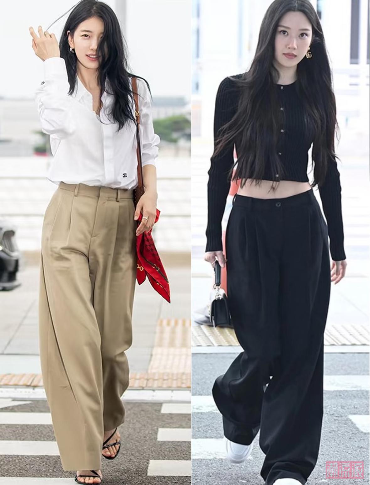 长裤盖鞋面:穿长款阔腿裤、直筒裤时,裤脚刚好盖住鞋面1cm,别堆在地上(显邋遢),也别太短(露太多袜子显土),搭配厚底乐福鞋或者高跟细,悄悄增高。