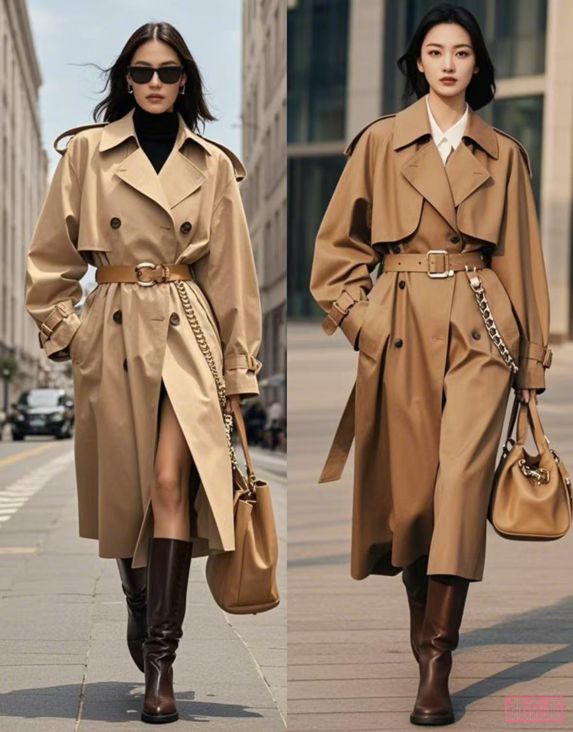 大衣系腰带:别让大衣“直愣愣”挂着!中长款大衣系腰带时,把前襟交叉后再系,腰带位置在腰线以上,比如“咖色风衣+腰带”,既收腰又显腿长,走路带风。
