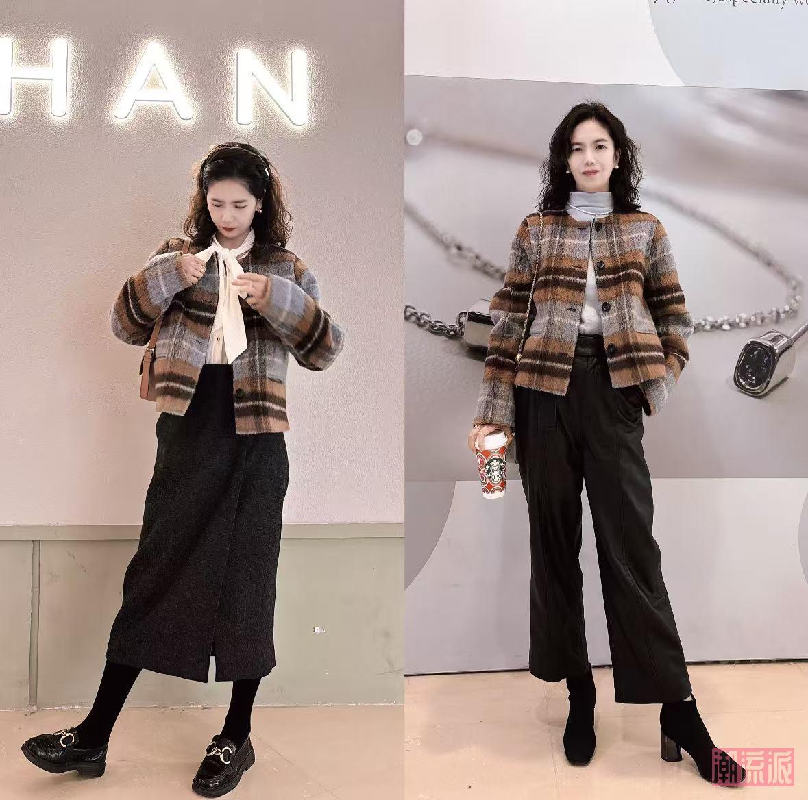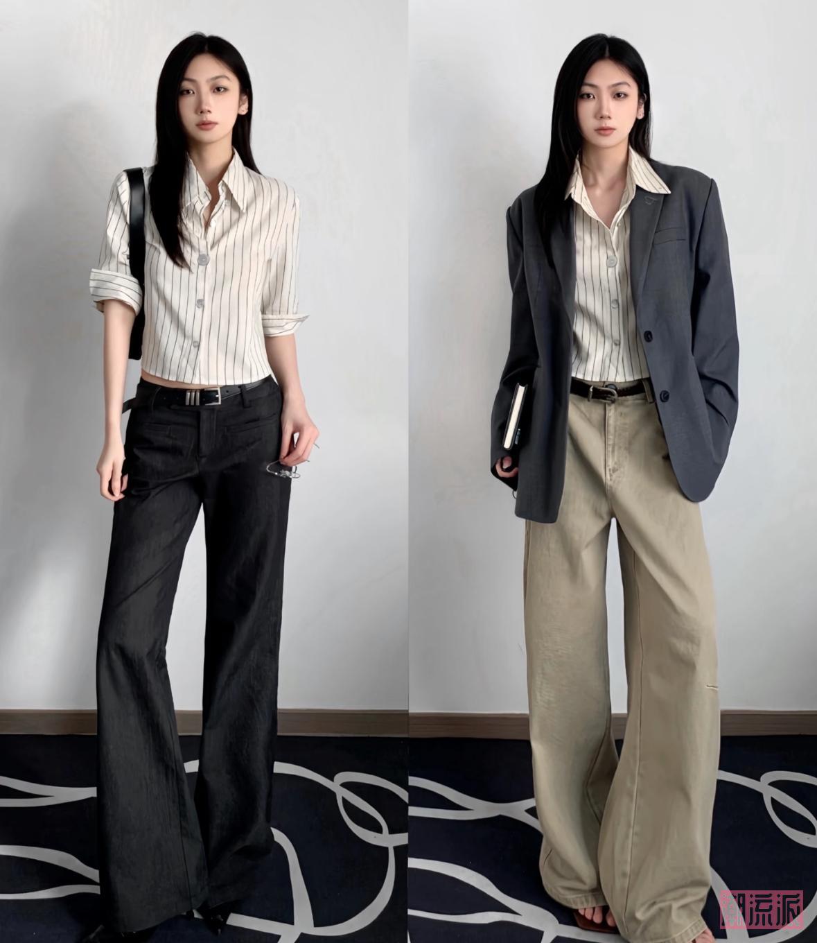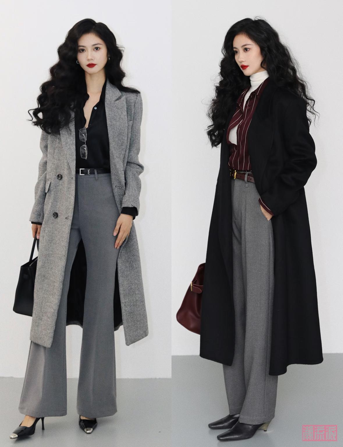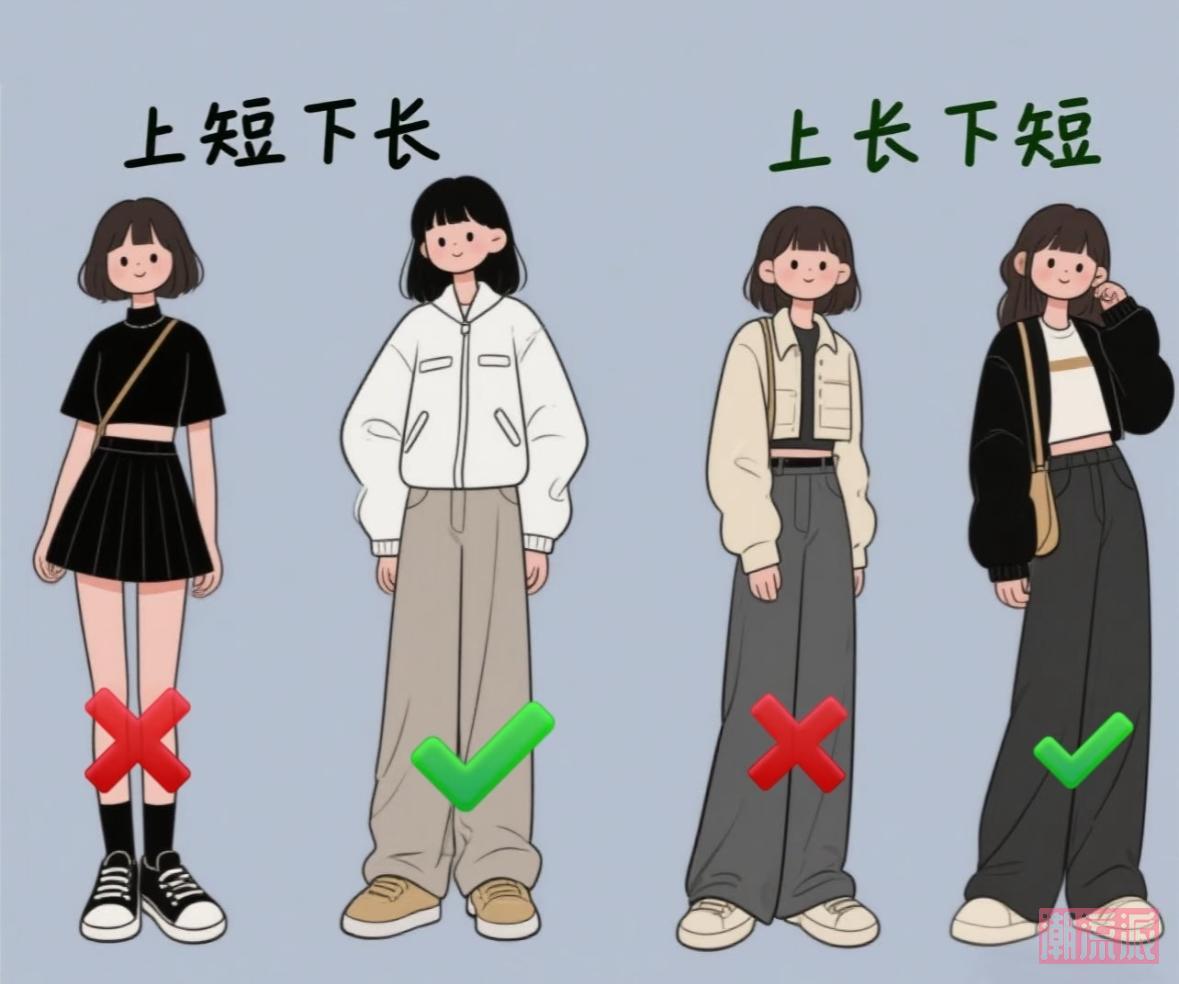 对比效果:短款外套+高腰裤 vs 长款外套+低腰裤,前者直接拉高5cm,后者秒变“小矮人”,一目了然!