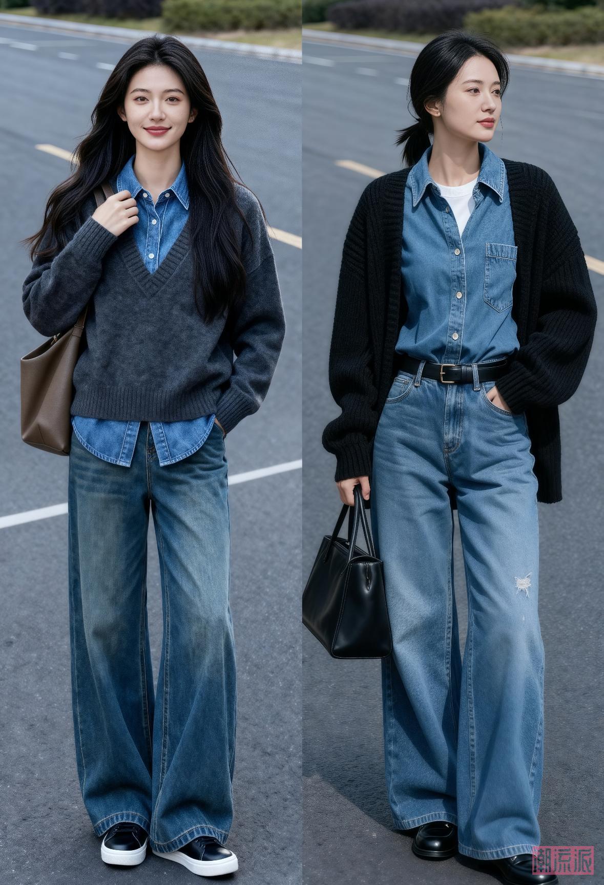穿搭示范:打底衫(薄款)+ 马甲(短款)+ 外套(合身),比如“白色T+蓝色衬衫+黑色短款针织衫+高腰牛仔裤”,3层保暖又显瘦。