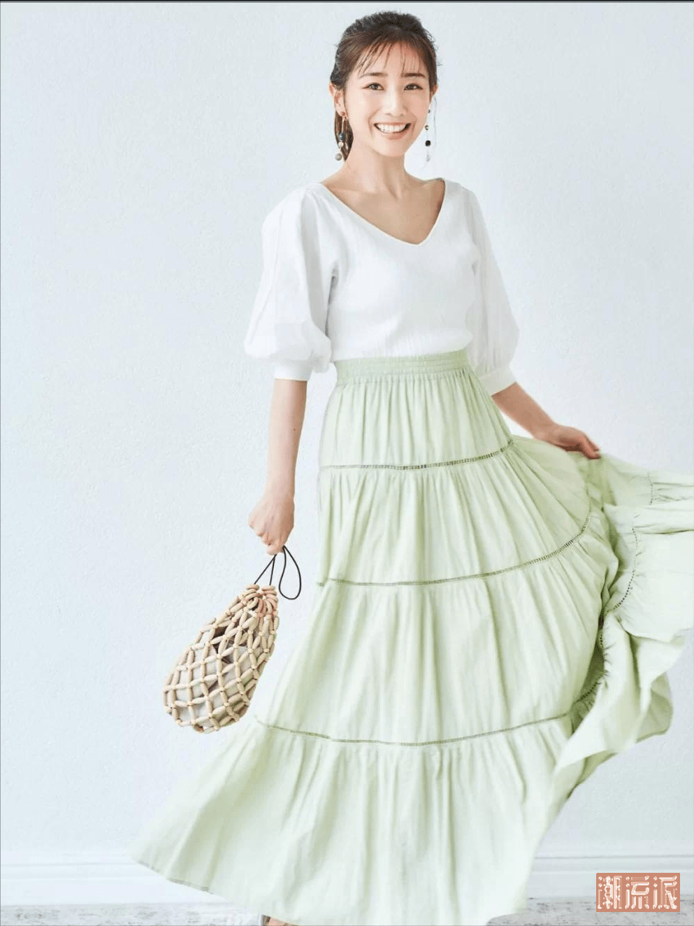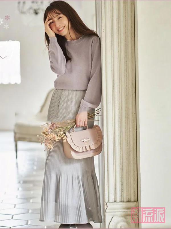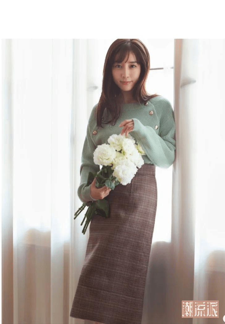 田中美奈实的裙装多为脚踝以下的长度,这样的长度于视觉上会更有连贯性,因此也具有显高效果。另外,需要注意的是,要避免大面积拼色款式的裙装,视觉上也会有显矮的风险。