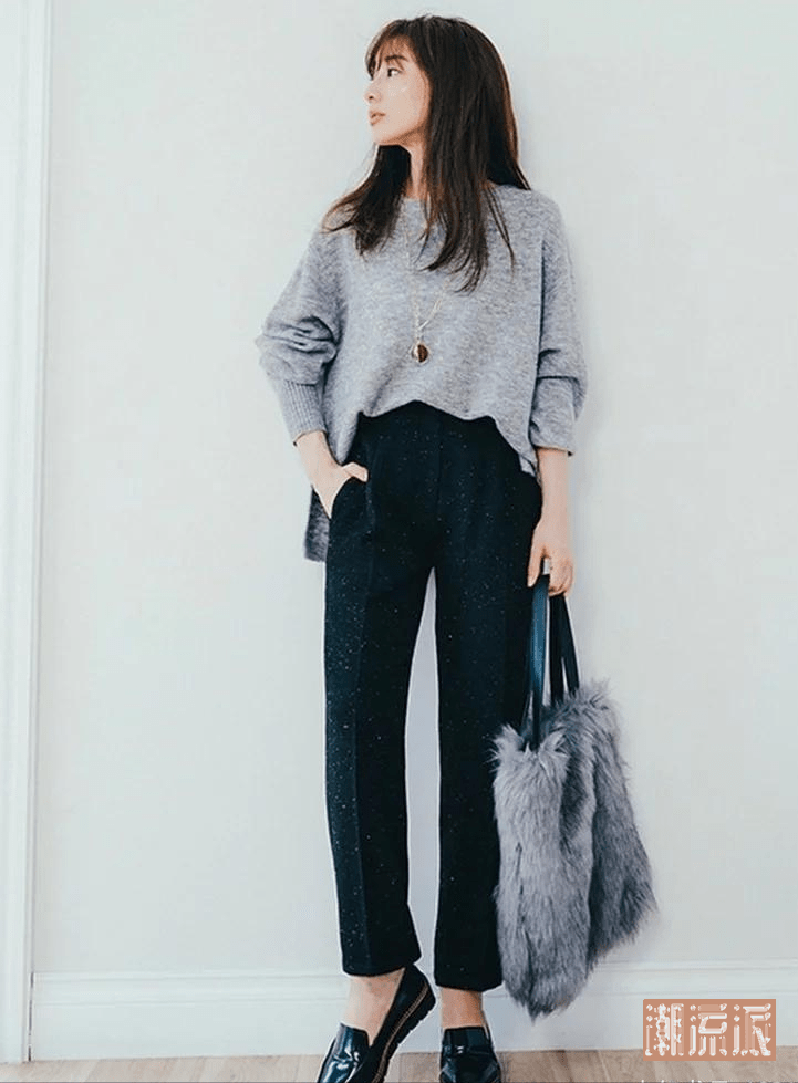 九分西装裤,露出纤细的脚踝,显瘦的同时于搭配上也有更多选择。前扎后放的毛衣,展现出高腰线,同时也遮住了臀部的肉。长项链拉长颈部线条,也有着视线上移的效果,且也为单调的服装带来更多看点。