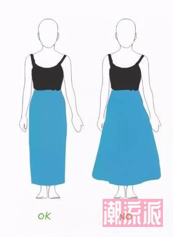 于版型上,选择较为修饰身形的款式会更为显高。以裙装为例,例如A型长裙与H型长裙,两相对比,H型长裙会更为显高。这是因为在视觉上直筒型裙装有纵向延伸的效果,而裙摆过宽则会让视觉向两边延伸,虽更为遮肉,但视觉上就没有那么显高。同样,在裤装上选择更为修身的直筒裤,会比较为宽松的阔腿裤更为显高。